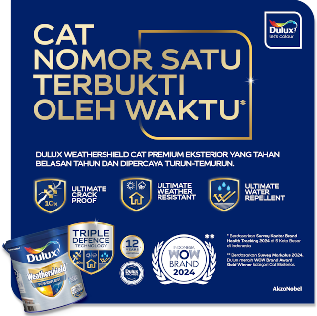 Dulux Weathershield berkomitmen terus memberikan kualitas cat terbaik yang tahan hingga 12 tahun dan dipercaya turun-menurun untuk seluruh konsumen di Indonesia.