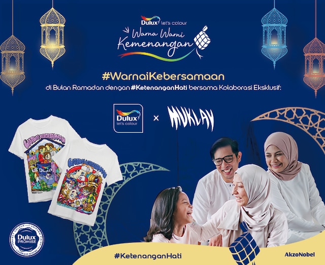 Di momen Ramadan kali ini, Dulux berkolaborasi dengan ilustrator terkenal yaitu @Muklay. Gaya ilustrasinya yang nyentrik dan penuh warna-warna terang serta outline yang tebal pada setiap karakter yang dibuatnya ini sesuai dengan semangat Warna-Warni Kemenangan dari Dulux yang ingin mewarnai kebersamaan di momen spesial ini. Kolaborasi ini hadir dalam bentuk T-shirt eksklusif untuk menyebarkan pesan #WarnaiKebersamaan selama bulan Ramadhan hingga saat bersilaturahmi di momen Idul Fitri.